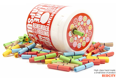 유리병같이 투명한 캡슐에 5가지색의 편지를 써서 보관하는 방식